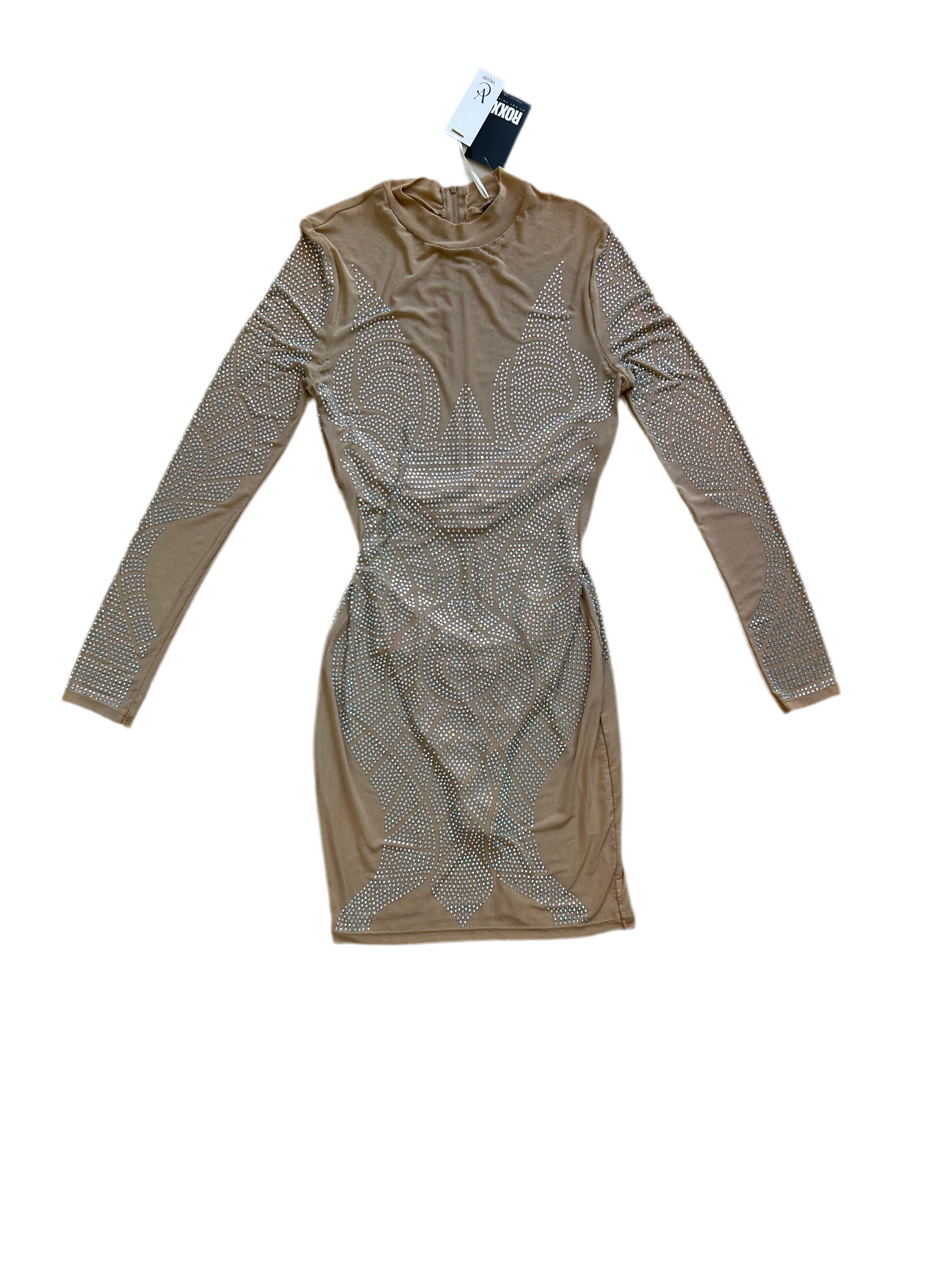 Nude rhinestone studded mesh long sleeve dress